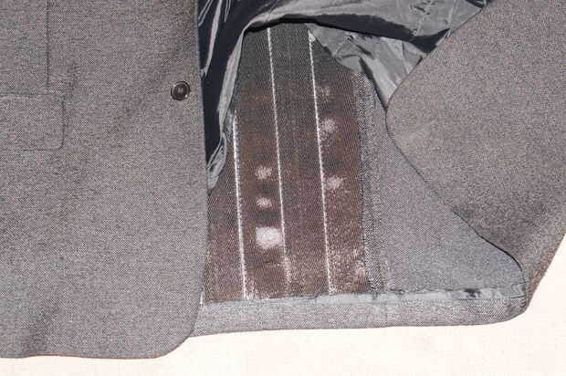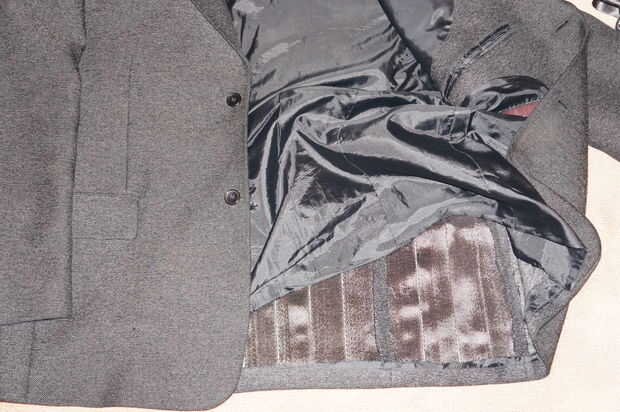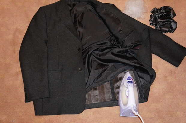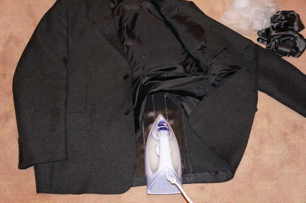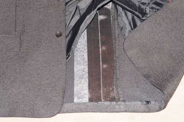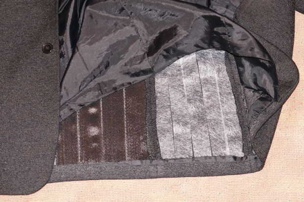 Ponga una tira de hierro-en no-coser dobladillo cinta superior con una tira de cinta de carbón. Planche con una plancha. Conveniente operar Si corta pequeños trozos de cinta de carbón y difundir dentro de su chaqueta, como un mosaico. Coloque las tiras de cinta de carbón tan cerca como sea posible entre sí, para evitar lagunas.