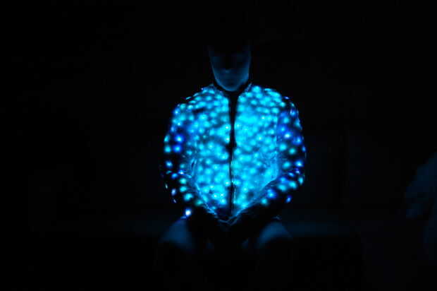 540LED  debía ser distribuidos en la chaqueta. El color he elegido fue aqua-azul con blanco. Cada cadena ligera funciona con 2 pilas AA, por lo que al principio pone los titulares de la batería en el interior de los bolsillos y luego fastend el LED en el botón de dormir en una división bastante evently utilizando cinta. Como quería el look de la chaqueta para ser un poco más decente, tuve que encontrar una manera para difundir los brillantes puntos de luz de los LED. Por lo tanto tomé un pad de cottonwool que era lo suficientemente delgada como para transmitir la mayoría de la luz hacia el exterior pero también era lo suficientemente gruesa como para difundir las ondas ligeras. El cottonwool no es muy robusto y decidí cubrir la chaqueta entera con una hoja plástica transparente.