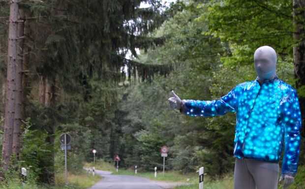 La chaqueta completa-vista es un sewable marco eléctrico que permite detectar objetos que se mueven por detrás a través de sensores de movimiento PIR, un Arduino, y anillos de LED.Cuando sale el sensor de movimiento de izquierda en la parte posterior