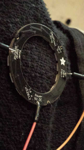 3. coser el anillo de NeoPixel al interior de la chaqueta, que tenga que ponerlo en conseguir la colocación del anillo a la altura correcta, y otra vez uso el extra de los agujeros que ya existen en el ring para coser en.