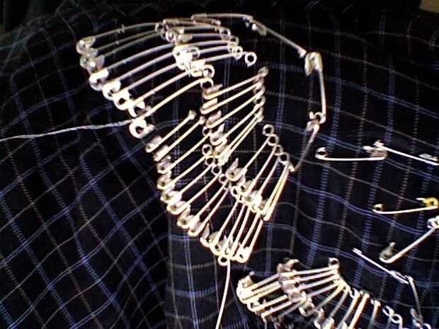 Cosas que "ll necesidad.1 imperdibles de varios tamaños2 granos3 cuerda elástica de4 cadena dePaso 1: Cómo hacer un collar de perno de seguridad.Usted usará una variedad de tamaños de perno de seguridad para hacer un diseño agradable. Sus pines y cad