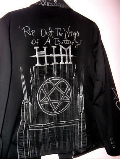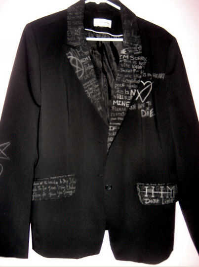 Blazer negro simple (interior alineado) con el edificio de un vídeo de música dibujado hacia fuera en la parte posterior.
