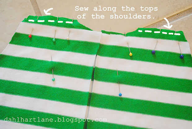 Apartar las mangas y trabajar en el cuerpo principal. Asegúrese de alinear las rayas cuando se cosen las piezas juntos.
