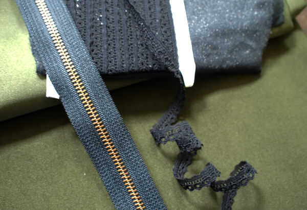 Tela de contraste: La tela de contraste, yo elegí a una tela verde más ligera con un acabado más brillante (aproximadamente 1 yarda). No pude encontrar a una tela verde clara con el mismo estiramiento como la tela principal, así que elegí un espesor similar, pero en un tejido no elástico. Para mí el color era el más importante.