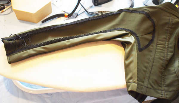 9) coser la cremallera hasta el final de la apertura de la manga. Y también coser cremallera hasta el final del hombro y el cuello. El margen más amplio permitirá que los dientes de la cremallera para exponerse sin abrochar a la tela. Repita este paso en el otro lado.