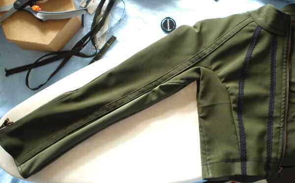 8) en este punto, debe tener la cáscara entera de la chaqueta cosida, que no sea la costura exterior de brazo/hombro/cuello. Todavía debe estar abierta. De esta costura, hay dos cremalleras en cada extremo. Marque 7" de la parte superior del cuello y 8" de la abertura de la manga. Coser la distancia en el medio.