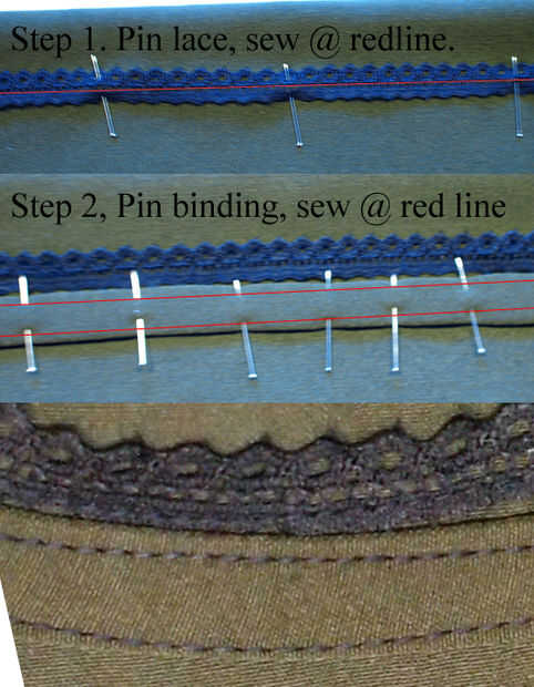 Luego coloque el enlace alrededor de la puntilla por consiguiente, la clavija y coser. Este es un detalle muy importante, así que trate de practicar en retazo primero. :) Vea arriba para cuadros detallados paso a paso sobre cómo se cosen los enlaces de encaje.