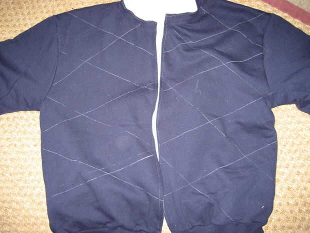 empecé con una sudadera con capucha. El plan es utilizar material extra de la campana para hacer el collar. Yo quitar la cremallera y reemplazarlo con un botón. Pensé en cómo coser botones en la manga y los bolsillos por lo que son las ranuras y más