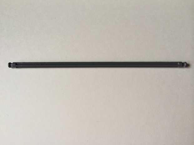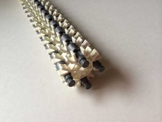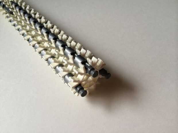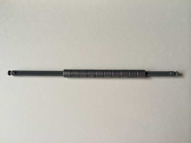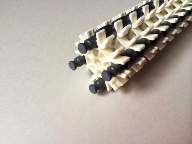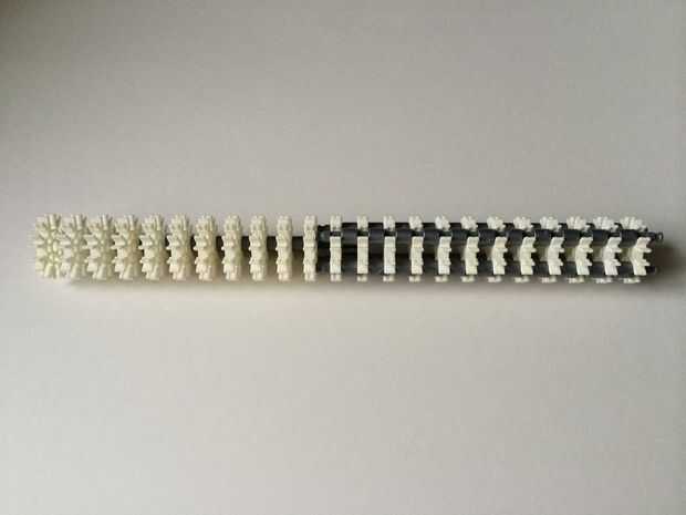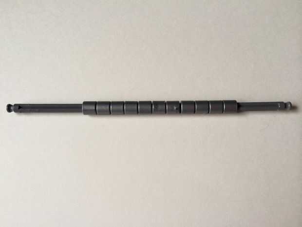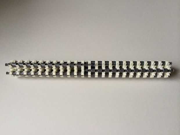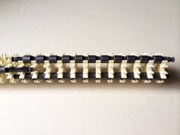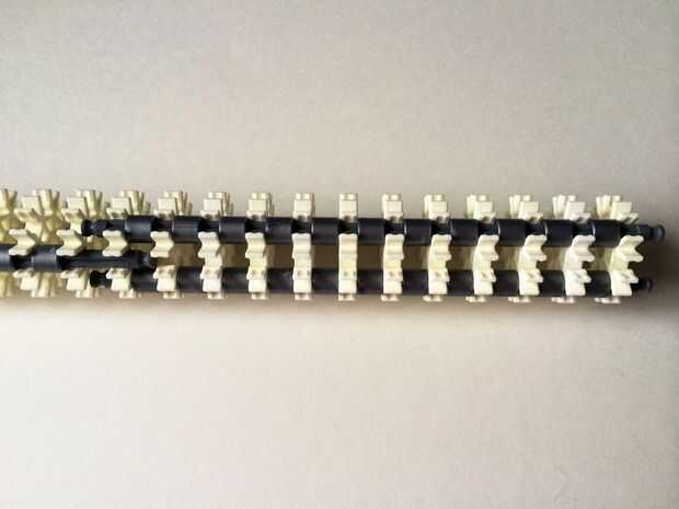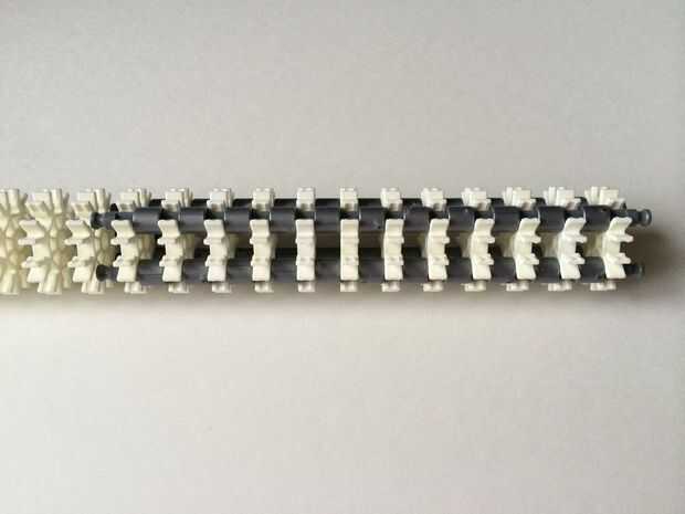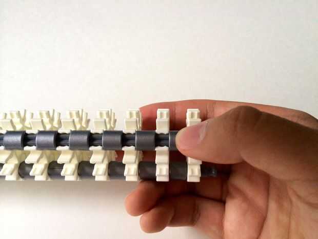 Agregar más barras grises y separadores gris a lo largo de la empuñadura hará que sea mucho más robusta.Para añadir rigidez a la primera sección de la empuñadura (del paso 2), deslice primero once separadores gris en una barra gris, como se muestra en fotos 1 y 2. A continuación, agregarlo a la primera sección de la empuñadura como en la foto tres. Ayuda para empujar hacia abajo en los separadores de gris para minimizar la deformación del dedo y una posible lesión (foto 4). Continuar agregando barras de rigidez hasta que hay cuatro equidistantes alrededor de la empuñadura, como en fotos 5, 6, 7 y 8. Repita el proceso para la segunda sección de la empuñadura (del paso 3) como se muestra en fotos 9, 10, 11 y 12. Esta vez sólo hay 10 separadores gris en cada barra de rigidez (cuadro 10).