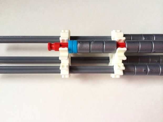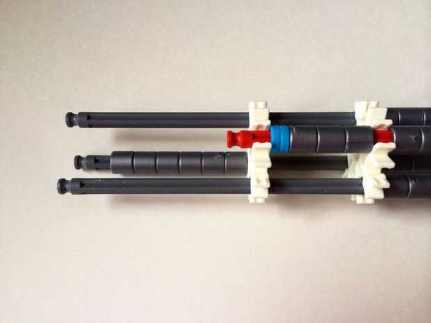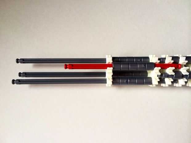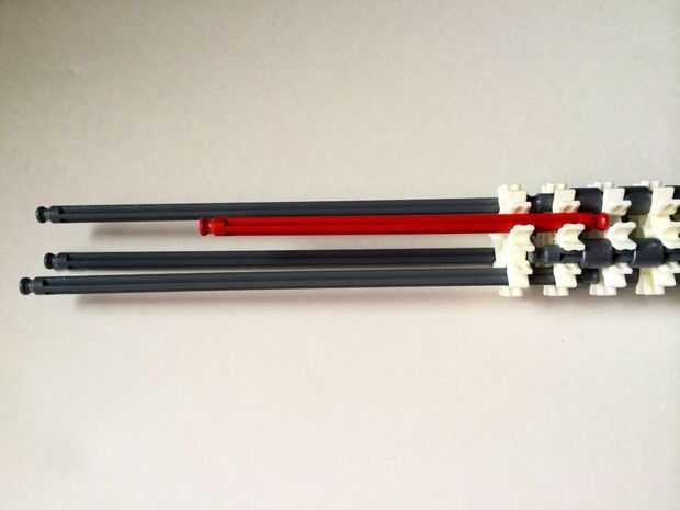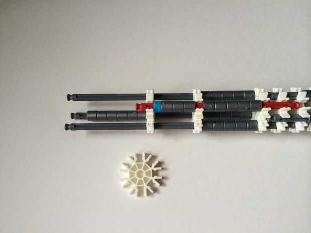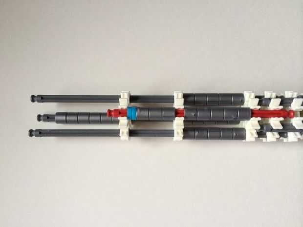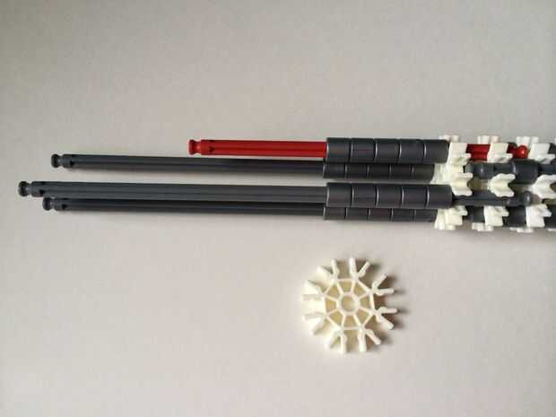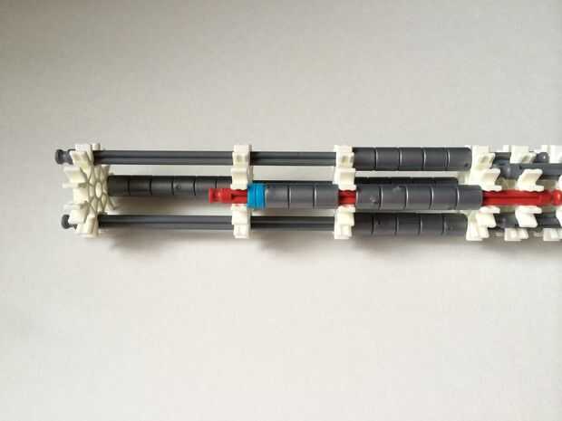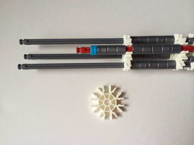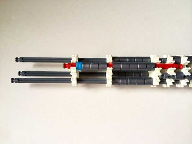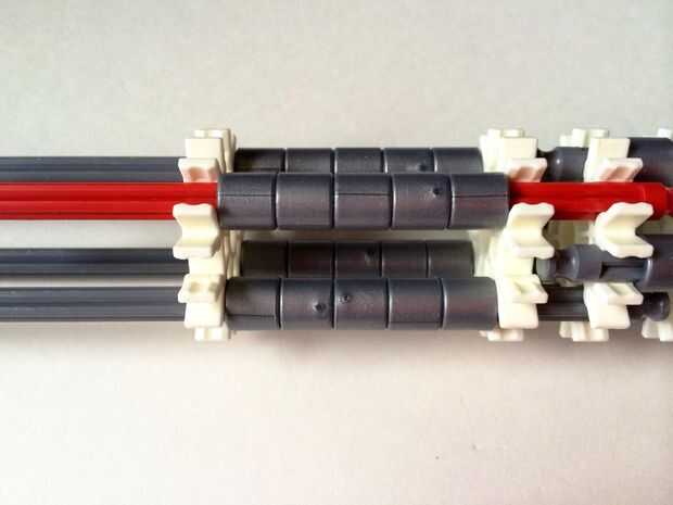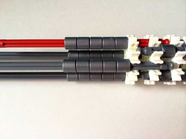 El punto de fijación de la cuna es donde la parte de la plataforma que el dispositivo está conectada a la empuñadura.Comience agregando tres barras gris hasta el final de la empuñadura, (el extremo de la pieza del paso 3) como en fotos 1, 2 y 3. A continuación, añadir una barra roja para completar la formación de la "Plaza", como en cuadros 4, 5 y 6. A continuación, agregue un conector blanco, como en cuadros 7, 8 y 9.Añadir cinco conectores gris a cada una de las cuatro barras extendidas, como en fotos 10 y 11. A continuación, añadir otro conector blanco, como en fotos 12, 13 y 14. Añadir tres separadores gris y dos separadores de azul la barra de rojo, como en cuadros 15 y 16. Luego agregar otro conector blanco (cuadros 17, 18 y 19). Añadir seis separadores gris a la barra gris de abajo, como en cuadros 20 y 21. Añadir un conector blanco más, como en los cuadros 22, 23 y 24, y el punto de fijación de la cuna está ahora completo!