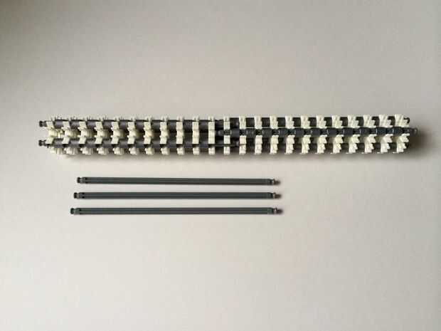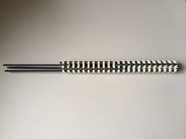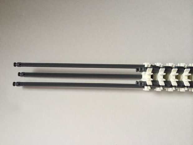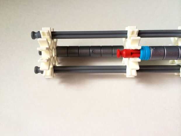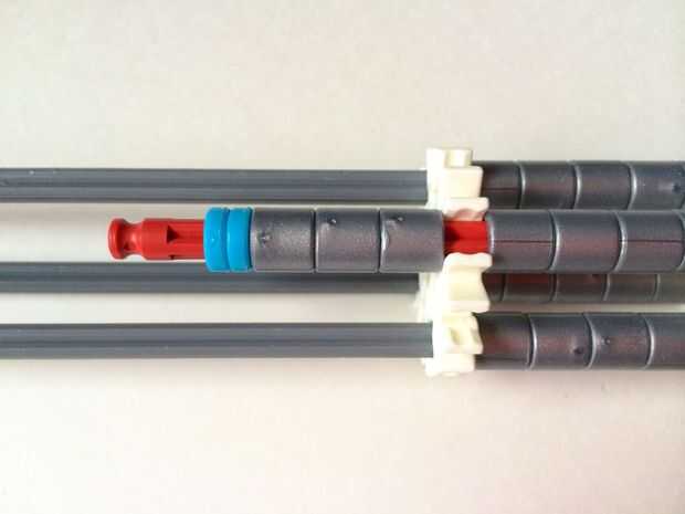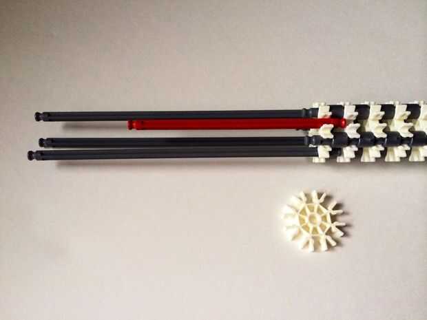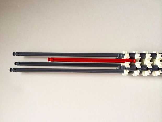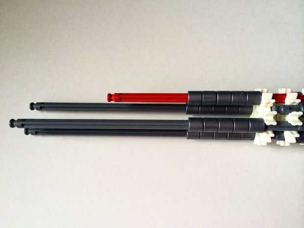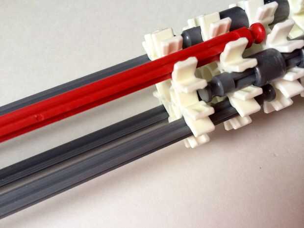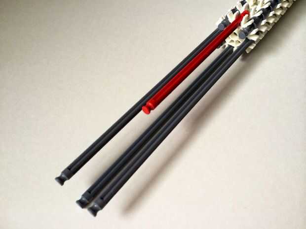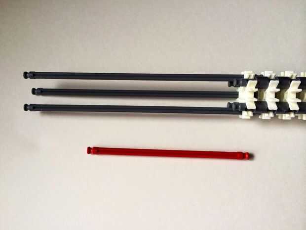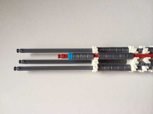 El punto de fijación de la cuna es donde la parte de la plataforma que el dispositivo está conectada a la empuñadura.Comience agregando tres barras gris hasta el final de la empuñadura, (el extremo de la pieza del paso 3) como en fotos 1, 2 y 3. A continuación, añadir una barra roja para completar la formación de la "Plaza", como en cuadros 4, 5 y 6. A continuación, agregue un conector blanco, como en cuadros 7, 8 y 9.Añadir cinco conectores gris a cada una de las cuatro barras extendidas, como en fotos 10 y 11. A continuación, añadir otro conector blanco, como en fotos 12, 13 y 14. Añadir tres separadores gris y dos separadores de azul la barra de rojo, como en cuadros 15 y 16. Luego agregar otro conector blanco (cuadros 17, 18 y 19). Añadir seis separadores gris a la barra gris de abajo, como en cuadros 20 y 21. Añadir un conector blanco más, como en los cuadros 22, 23 y 24, y el punto de fijación de la cuna está ahora completo!
