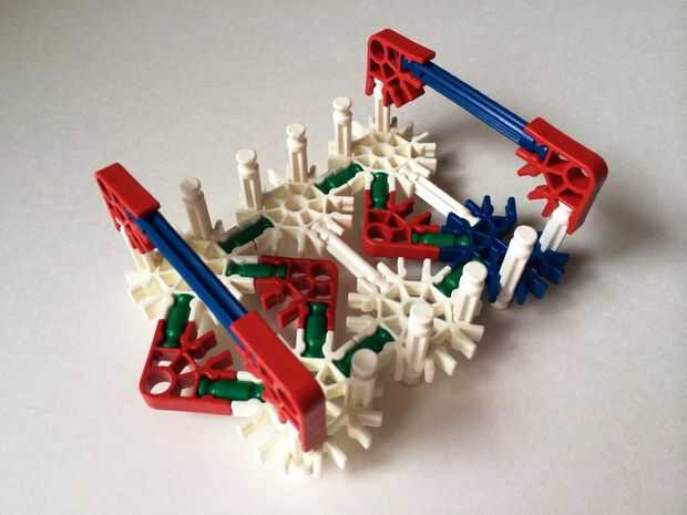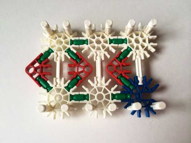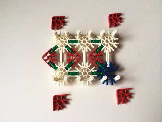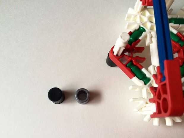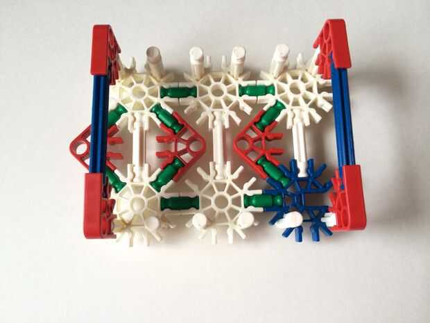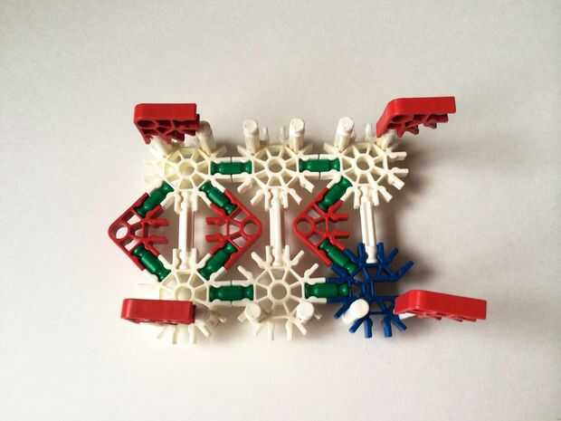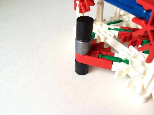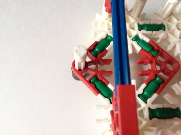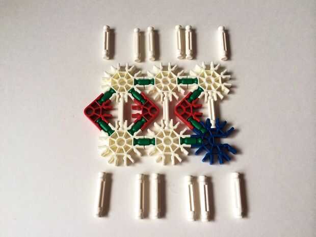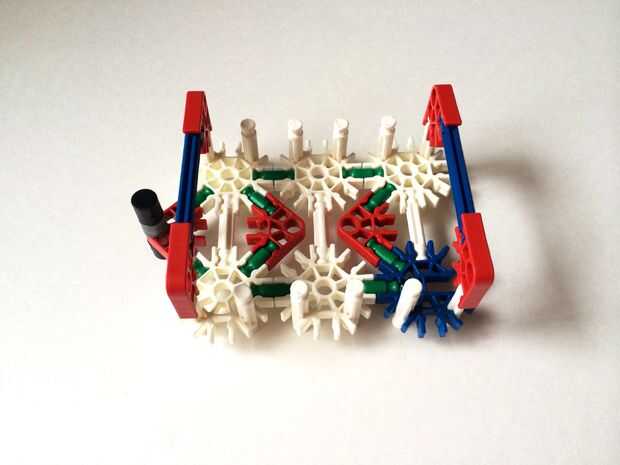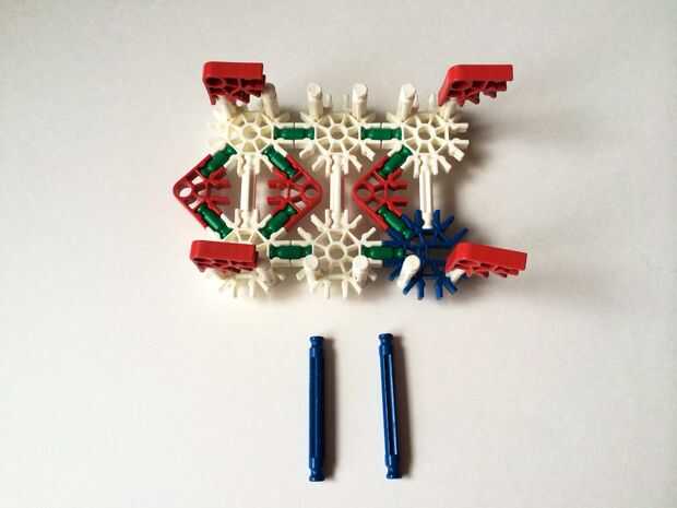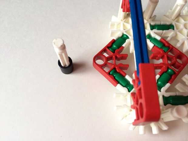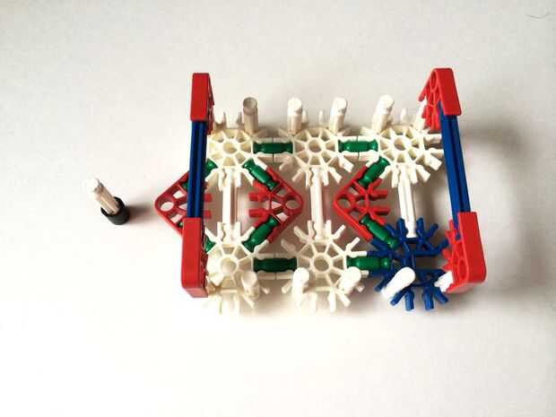 Añadir barras de doce a la cuna del forro como se muestra en fotos 1 y 2. A continuación, agregue cuatro conectores rojo a las barras blancas que se muestra en la fotos 3 y 4. Conecte cada par de Cruz de conectores rojo con varillas azules como se muestra en las imágenes 5, 6 y 7. Añadir una barra blanca con una gorra negra en el conector rojo en la base como se muestra en cuadros 8, 9, 10 y 11. Luego, añadir un conector gris y otro negro tapa a la barra blanca como en los cuadros 12, 13 y 14. La cuna está ahora completada!