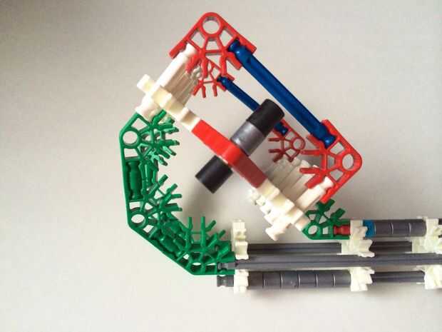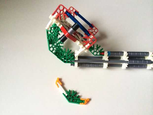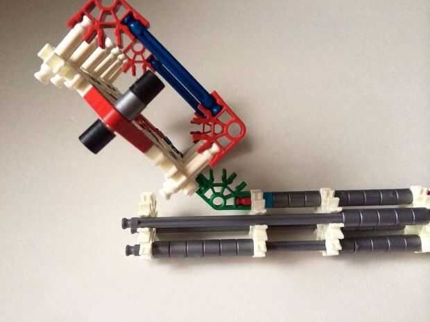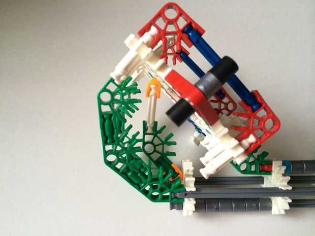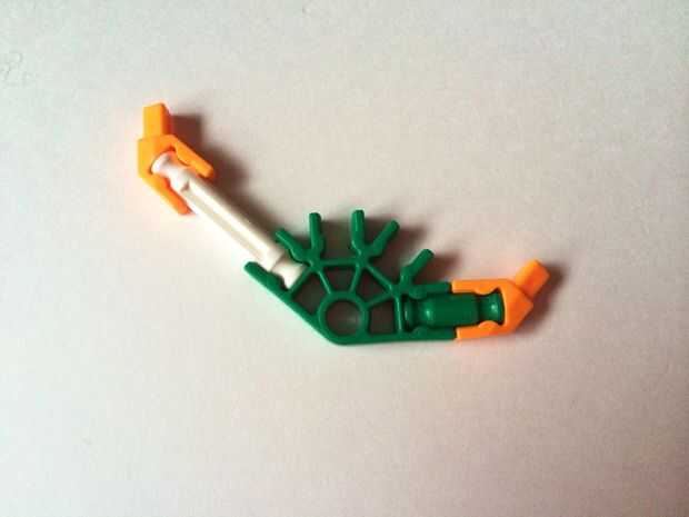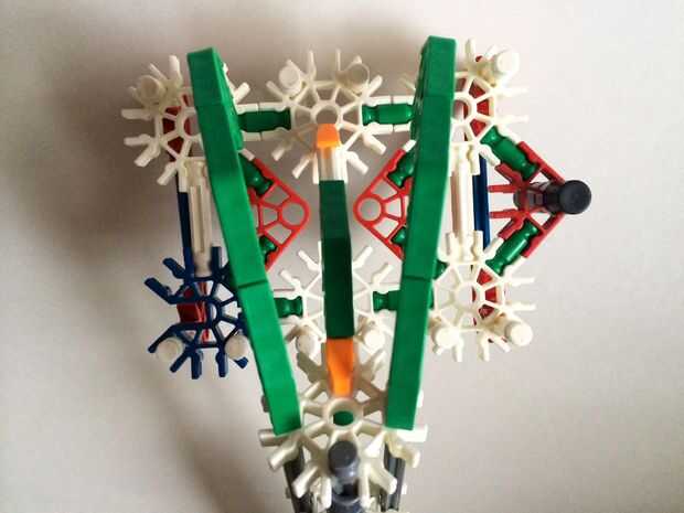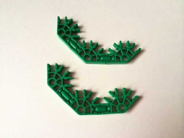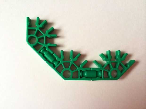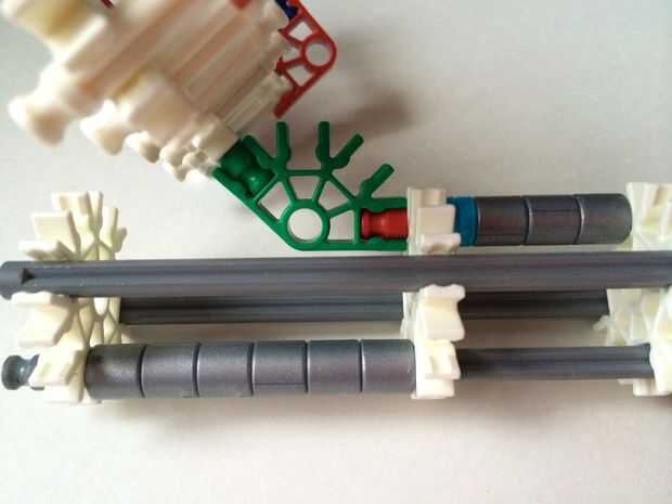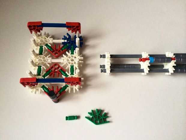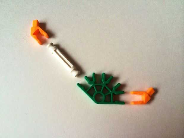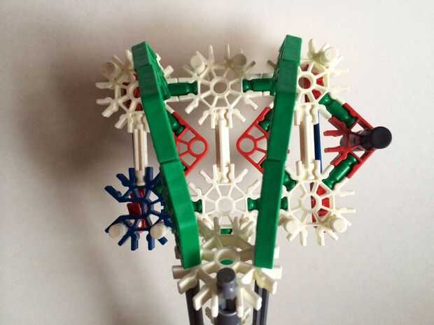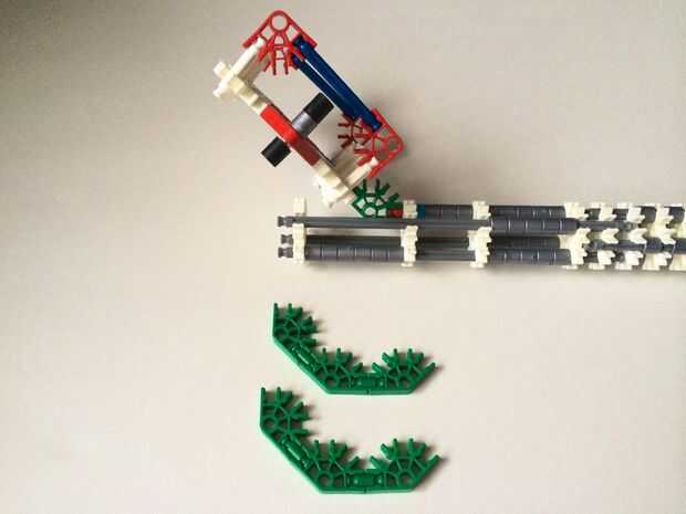 Comience por conectar el conector del medio fondo blanco de la base hasta el final de la barra roja en el mango usando un conector verde y la barra verde (fotos 1, 2 y 3). A continuación, conecte tres conectores verdes con barras verdes como en cuadros 4 y 5. Repetición para hacer dos piezas como en cuadro 6. Conecte a la parte posterior de la base y el agarre como en cuadros 7, 8 y 9.Conecte dos conectores "Y" diagonal a un verde y blanco como en la barra de cuadros 10 y 11. Añadir esta pieza a la parte trasera de la cuna, como en fotos 12 y 13.