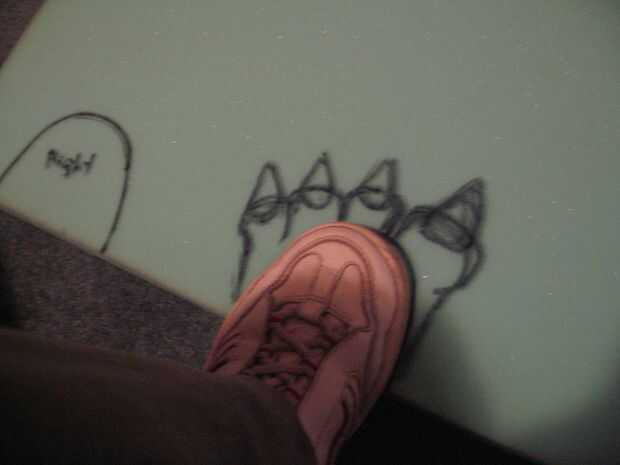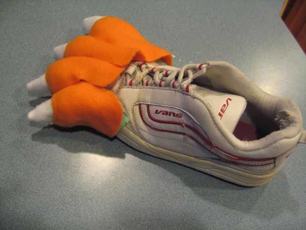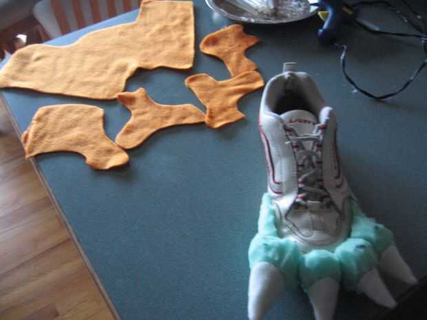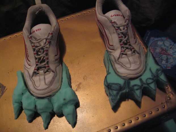 Pies: Los pies se construyen fuera de un viejo zapato tenis. Localizar la parte delantera del zapato sobre la espuma de tapicería y me dibujó un esbozo de mi dedos de los pies de dragón. Usted necesitará duplicar esto en el pie opuesto cada paso del camino. Corte los dedos de los pies hacia fuera y hotglued a la parte delantera de la zapatilla. Usando las tijeras, tallado hacia fuera de cada uno de los dedos del pie.