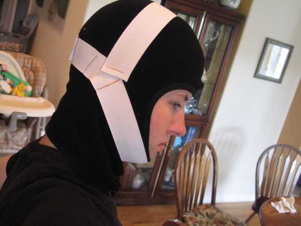 Desde aquí se trata de esculpir el aditiva y sustractiva de la espuma con unas tijeras. Se pegue la espuma directamente sobre el pasamontañas. Esto ayuda a tener una base principal apoyo a su trabajo, utiliza un soporte de cabeza/peluca de espuma de poliestireno, pero esta cabeza es más pequeña que el mío así que le sugiere lo que abulta un poco. De lo contrario Asegúrese de que es cómodo y se ajusta bien sin ser demasiado intentando constantemente como trabajas. Siempre empiezo con los ojos para saber donde será mi visión y cómo es grande los ojos van a estar en comparación con el resto de la cabeza a proporciones del equilibrio. Hacer una plantilla de ojo de papel para ello. Construir para arriba alrededor de los ojos primero.