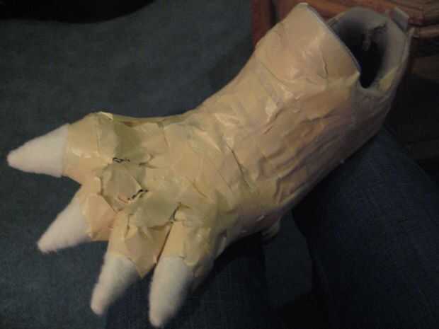 Las manos: Las manos son fundamentales. Rastrear mis manos en un pedazo de papel, dibujaba un contorno alrededor de ellos significativamente mayor (aproximadamente una pulgada alrededor de mi mano) y recórtalo. I había trazado de la plantilla de papel sobre mi tela, había cortado en dos mitades y les cosieron. Prueba de ajuste y darles vuelta adentro hacia fuera. Tuve que hacer las manos 4 veces diferentes hasta que conseguí un buen ajuste-ajustar el patrón cada vez. Las garras hizo una forma de cono del paño grueso y suave, cortar los extremos de los guantes y pegado en las garras en el interior borde.