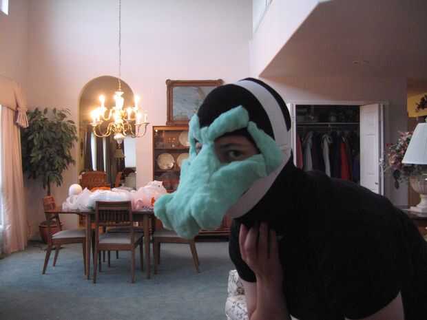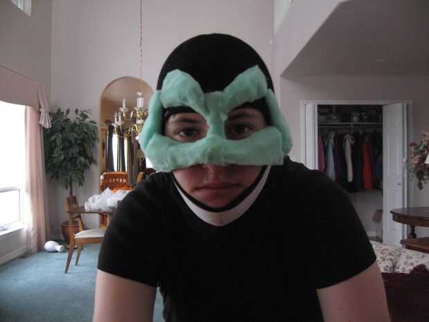 Cabeza: Construí la cabeza de un pasamontañas. Esta mascarilla tiene una mudanza de la quijada, así que cuando abrir y cerrar mi boca, también lo hace en boca del personaje. Conseguir este efecto cosí pedazos de elástico para el pasamontañas como se muestra. Hasta el punto de esto es para asegurar que el pasamontañas es apretado en mi cara para leer mejor mis movimientos mandibulares: el elástico se alarga cuando mi boca se abre y ayuda a tirar de la mandíbula inferior del personaje hacia arriba cuando cierro mi boca. El elástico debe quedar ajustado pero no demasiado apretado - obtener los mejores resultados haciendo bajo la tensión de la mayoría en la parte posterior de mi cabeza, tensión neutro debajo de mi barbilla y media tensión en la parte superior de mi cabeza.