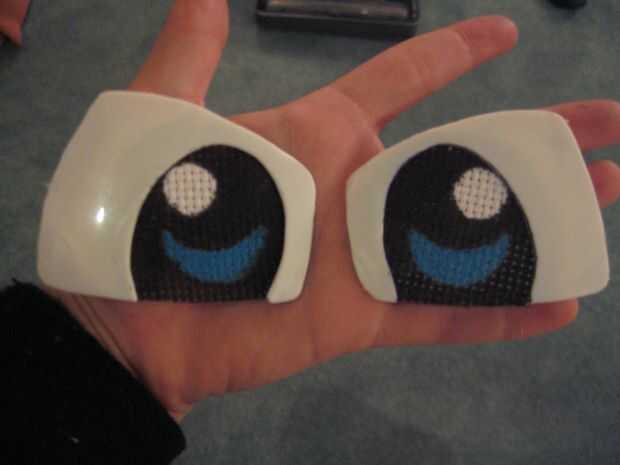 Ojos: Los ojos están hechos de un recipiente de plástico barato del piezas-calor blanco brillante para arriba el tazón de fuente ejecutando bajo agua caliente y pueden cortar más fácilmente con las tijeras. O usar una herramienta Dremel. Para la parte que se va viendo a través de este es un tejido de punto de cruz con pequeños agujeros en el llamado paño de aida. También te recomiendo tratar de bocací ya que es más rígido. He utilizado marcadores Prismacolor para color de los ojos aunque pintura funcionará (siempre y cuando no obstruyen los agujeros) pero yo recomiendo mantenerse alejado de marcador lavable. Con el calor de la mascarilla, humedad puede acumularse y causar sus colores ejecutar. Simplemente se pegan los ojos.
