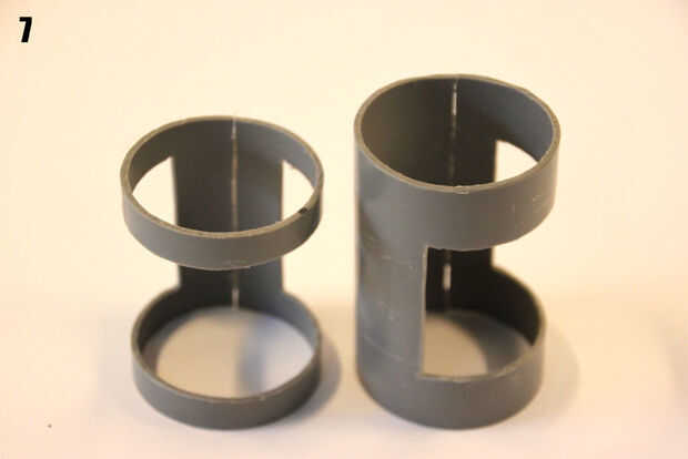 Sierra de 2 piezas de tubo de PVC (foto 7). Se necesitan dos piezas porque una pieza no es lo suficientemente fuerte para tirar hacia atrás el cable. Una pieza es 75 mm con un borde de 18 mm y el otro es 65 mm con un borde de 10 mm. El ancho de la llanta determina la fuerza de su resorte de PVC.