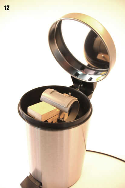 El mecanismo en la bandeja de parlante se parece un poco a un pingüino (foto 10). El pico del pingüino empuja abierto la tapa del recipiente. El "pingüino" es accionado por un pedal sentados en el suelo. Eso es! Hice un pedal adicional para un cubo de pedal. Este pedal extra le permite controlar el movimiento de la luz. Y la sorpresa para su público es más grande cuando el recipiente comienza a hablar y no está tocando el pedal de la papelera.