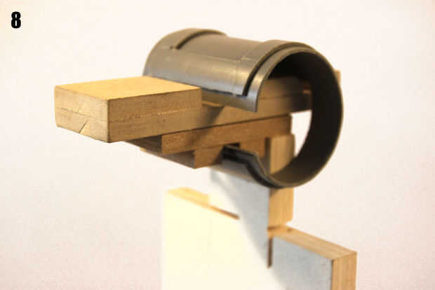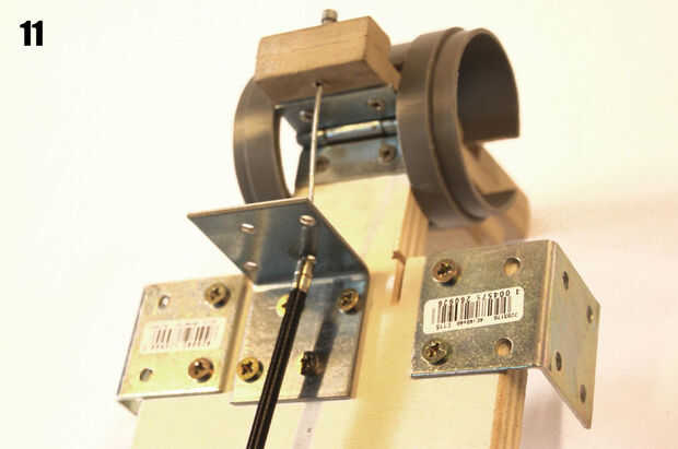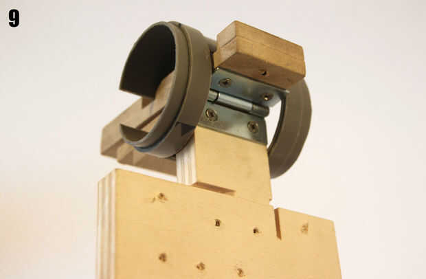 La parte inferior del pico se enrosca en el cuello del cuerpo (Fig 5). La parte superior del pico se fija al cuello con la bisagra pequeña (foto 6). Antes de hacerlo debe instalar los resortes del PVC. Usé un tubo de PVC para hacer un muelle que cierra el pico. Esto tira el cable del freno hacia atrás (más sobre esto más adelante).
