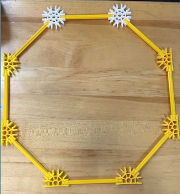 Hacer un octágono con 6 conectores amarillo 180 grados y 8 palos amarillos y 2 conectores blanco 360 grados