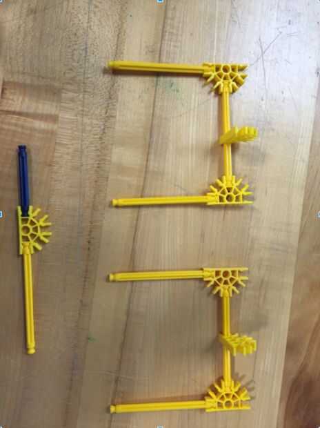 Por separado tomar 3 amarillo palos y hacer parte de un cuadrado utilizando los conectores de 180 grados y coloque un conector en el centro - stick hacia arriba. Repita el paso para que tengas 2. Luego tomar 1 palos amarillo y palo azul 1 y conectarlos mediante un conectores de 180 grados