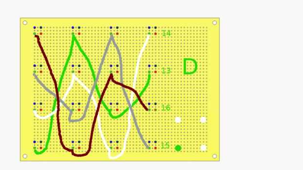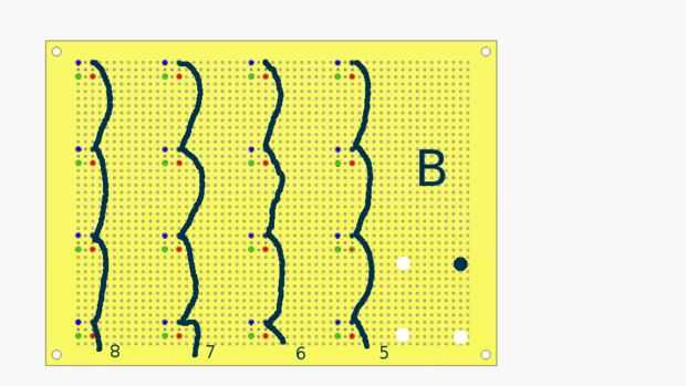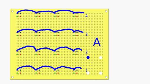 Los siguientes cuatro dibujos muestran el cableado para cada grupo de letras. Tenga en cuenta, "A" s utiliza la misma ubicación del pin de aguja, todas la s de "B" utiliza la misma ubicación del pin aguja... Usted puede hacer más fácil llegar a hacer todo como en un momento, luego el Bs, luego el Cs, luego las Ds. El primero 2 sets son fáciles.