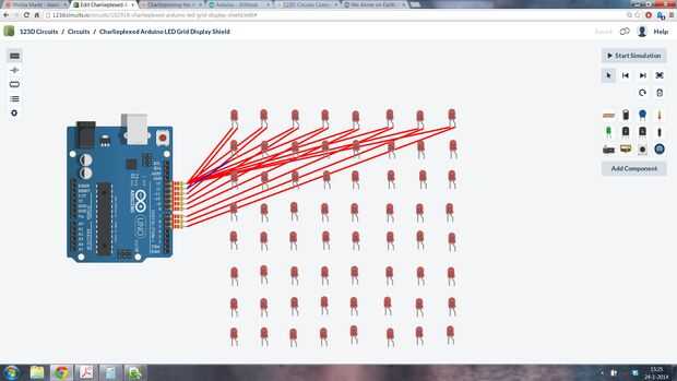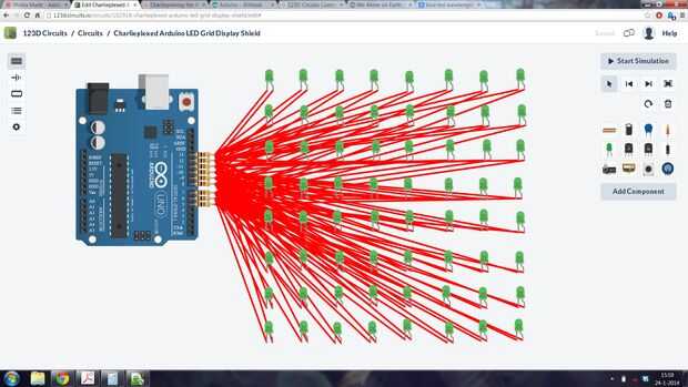 El trabajo en el 123D es muy tedioso, después que las resistencias comienzan con duplicar un montón de LEDs en una cuadrícula. Comencé con LEDs rojos, pero más tarde descubrí que el parpadeo del verde fue más visible en el software, por lo que cambié a todos.