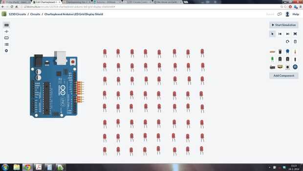 Primero agregue las nueve resistencias de limitación actuales en los pines de Arduino. En el software les dio un valor de 100 ohmios, pero en realidad, se prefiere 10 ohmios o incluso sin resistencia. Esto es porque cada LED parpadeará solamente muy poco, por lo que no es mucho riesgo de quema.