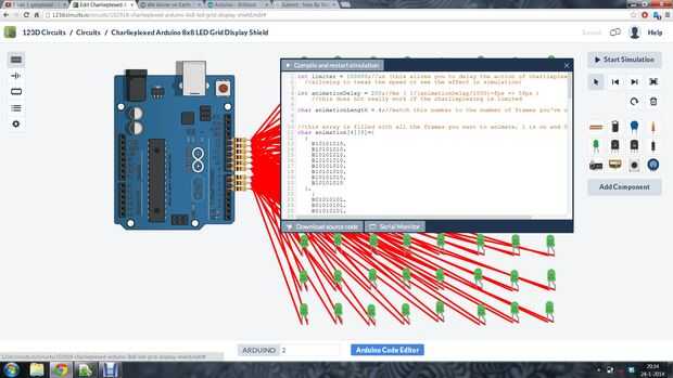 int limiter = 100000;//us (this allows you to delay the action of charlieplexing, //allowing to tweak the speed or see the effect in simulation) int animationDelay = 200;//ms ( 1/(animationDelay/1000)=fps => 5fps ) //this does not really work if the charlieplexing is limited char animationLength = 4;//match this number to the number of frames you've used //this array is filled with all the frames you want to animate, 1 is on and 0 is off char animation[4][8]={ { B10101010, B10101010, B10101010, B10101010, B10101010, B10101010, B10101010, B10101010 }, { B01010101, B01010101, B01010101, B01010101, B01010101, B01010101, B01010101, B01010101 }, { B00000000, B11111111, B00000000, B11111111, B00000000, B11111111, B00000000, B11111111 }, { B11111111, B00000000, B11111111, B00000000, B11111111, B00000000, B11111111, B00000000 } }; const int UPPERPIN = 13; //upmost pin const int LOWERPIN = 5; //lowest pin //this is the charlieplexing mapping, see for more info: //http://wealoneonearth.blogspot.nl/2013/03/design-note-charlieplexing-led-matrices.html char mapping[8][8]={ {2,3,4,5,6,7,8,9}, {1,3,4,5,6,7,8,9}, {1,2,4,5,6,7,8,9}, {1,2,3,5,6,7,8,9}, {1,2,3,4,6,7,8,9}, {1,2,3,4,5,7,8,9}, {1,2,3,4,5,6,8,9}, {1,2,3,4,5,6,7,9} }; //two variables used for timekeeping int animationFrame=0; long animationTimer = 0; void setup() { //nothing to set up } void loop() { //a timer, so you can do some other stuff at the same time if(millis() - animationTimer > animationDelay) { animationFrame++; if (animationFrame>animationLength)animationFrame=0; } updatePins();//update the leds } //the function which manages the leds void updatePins(){ for(int i = 0;i<8;i++){ for(int j = 0;j<8;j++){ if(animation[animationFrame][i]& 1<<j){ //This function works in two parts // 1<<j makes 00000001 for j=1, 00000010 for j=2, etc // then the & operator compares that bit with what is in animation[] //so in total, it checks a specific bit in animiation[], //if it's 1, a led will light, if it's 0, it will not resetAllPins(); //turn off everything pinMode(UPPERPIN-mapping[i][j]+1, OUTPUT);//+1 for offset digitalWrite(UPPERPIN-mapping[i][j]+1, HIGH); pinMode(UPPERPIN-i, OUTPUT); digitalWrite(UPPERPIN-i, LOW); //the mapping array makes sure the right pins are turned on and off delayMicroseconds(limiter); //to be able to see the effect, we limit the speed } else resetAllPins(); } } } void resetAllPins(){ for(int i=LOWERPIN;i<=UPPERPIN;i++){ pinMode(i, INPUT); digitalWrite(i, LOW); } //set everything to high impendance, so it will not function in the circuit }