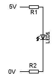 5V (el pin del microcontrolador) = 1,55 (R1) + 1.9V (LED) + 1,55 (R2) y todo lo equilibra.