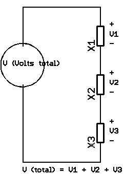 La primera ley de interés establece que el voltaje total a través de cualquier serie de componentes conectados en un circuito eléctrico es igual a la suma de los voltajes individuales a través de los componentes. Esto se muestra en el diagrama principal.