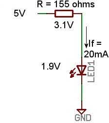 Así que si tenemos 5V para gastar y queremos 1.9V a través de lo LED para conseguir que se ejecute en 20mA entonces la resistencia a 5-1,9 = 3.1V a través de él. Podemos ver esto en el segundo diagrama.