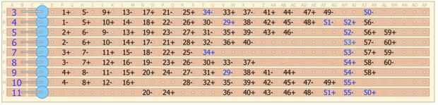 Elaboró el plan anterior para soldar los LEDs de charlie-plexed con una placa perforada: números azules en el diagrama anterior son debido a los errores mientras se suelda (y qué dolor era...).