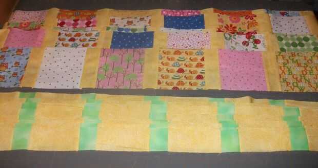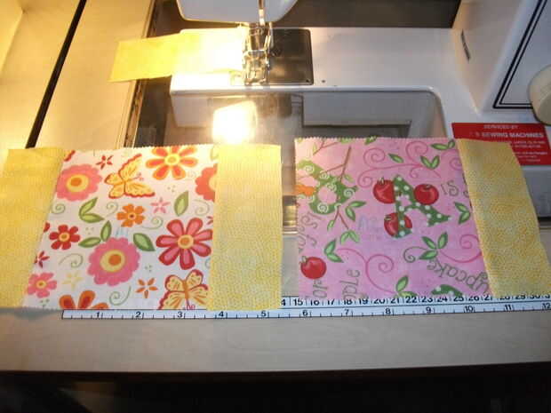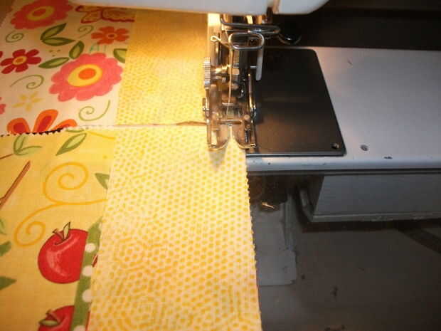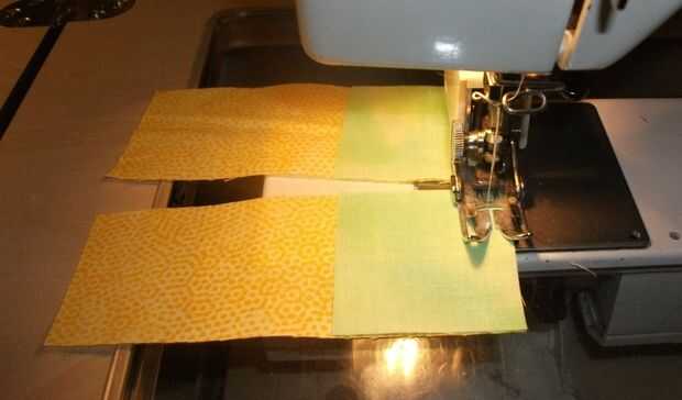 Teniendo cuidado de hacer coincidir sus bordes y esquinas, coser juntos su alterna pilares y bordes rectángulos, poner el telas derecho contra derecho, pero recuerda dejar cuando tengas 7 pilares y 6 rectángulos en cada fila. Terminarás con 8 de estas tiras.