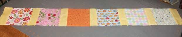 Coser un sashing rectángulo a la derecha de cada plaza de encanto, otra vez emparejar sus bordes y esquinas. Luego coser cada fila con juntas en orden y añadir un sashing rectángulo a la izquierda del cuadrado 1 en cada fila. Terminarás con 7 de estas filas.