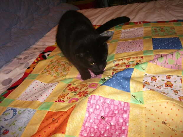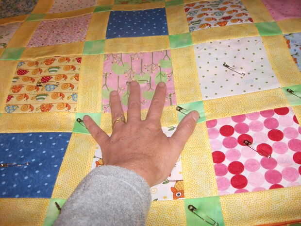 Hay una multitud de maneras de hilván edredones (ninguno de ellos implica la grasa caliente...) pero me gusta Hilvanar con pernos de seguridad. Deslice una almohadilla de corte o pieza de madera contrachapada lisa u otro material duro hoja bajo su sándwich de edredón. Comience en el centro de la parte superior de la colcha y poner un perno de seguridad en cada plaza de encanto y cada piedra angular. Si usted tiene suficientes pernos hacen los rectángulos sashing así.