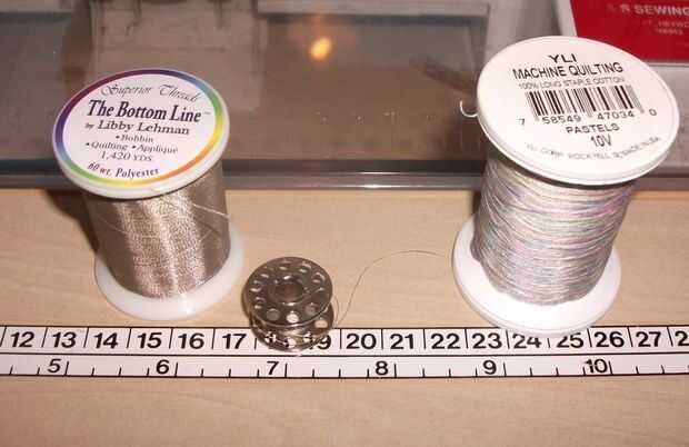 Cargar la máquina con el hilo de acolchar para el hilo superior, para el hilo de la bobina que me gusta usar un hilo más fino como se muestra. Usted puede utilizar el hilo de acolchar en la parte inferior también si lo prefiere, puede utilizar un hilo de propósito general para ambos, pero me gusta el cuerpo extra del hilo de acolchar y me gusta mucho las roscas variadas. Utilice una nueva aguja de acolchar adecuadamente dimensionada para el hilo superior. Acolchar agujas son muy afiladas y sujete el hilo firmemente como perforan todas las capas en su edredón. Buscar asesoramiento aquí. Establecer su puntada