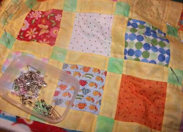 Quite los pernos, una vez hecho el acolchado y luego coser todo alrededor de la parte superior, cerca del borde como sea posible. Utilizar la regla más larga para recortar el respaldo con el borde de la parte superior, esto hace más fácil coser el atascamiento con un margen aún.