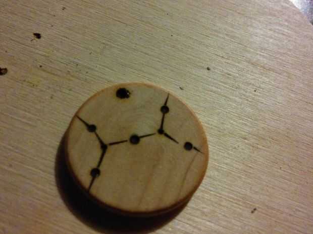 Usé mi punta pointiest de leña para presionar a través de la madera para quemar un agujero a través del encanto. Luego lo volcó y presiona el mismo lugar en el otro lado para hacer el agujero el mismo ancho de todo el camino a través.