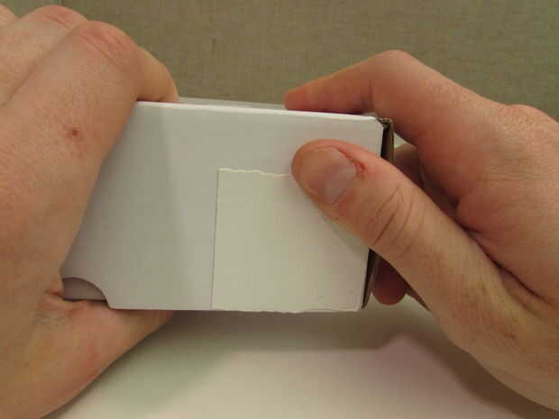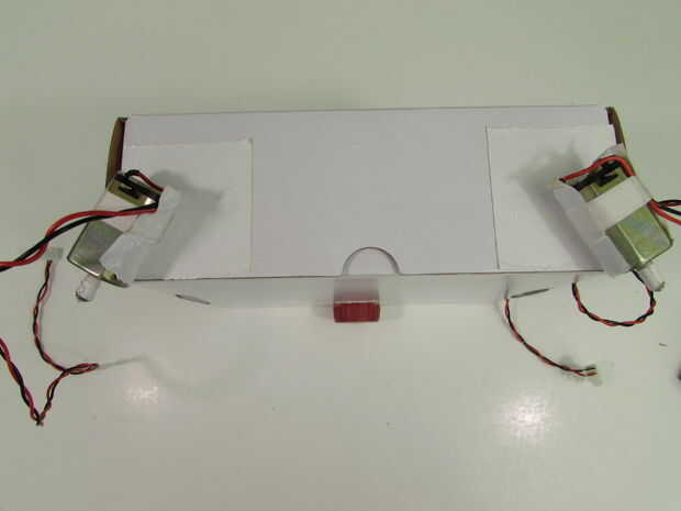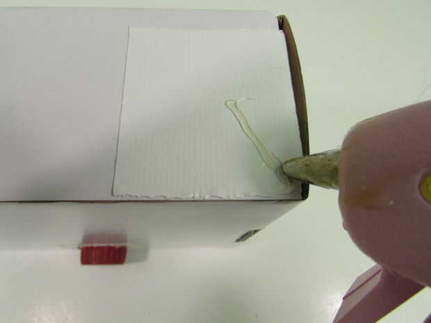 Voltee la caja otra vez y añadir una pieza aproximadamente cuadrada de cinta adhesiva a la parte frontal de tu caja, en una de las esquinas inferiores. Se trata de donde montamos nuestro motor.