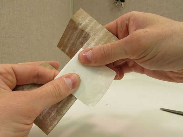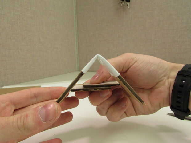 Ahora, arrancar un pedazo de cinta adhesiva y coloque el unbent piernas extremo uno contra el otro (lo que habría sido antes de cortarlas. Envolver las piernas juntas para que la cinta les permite doblar en el medio como una bisagra.