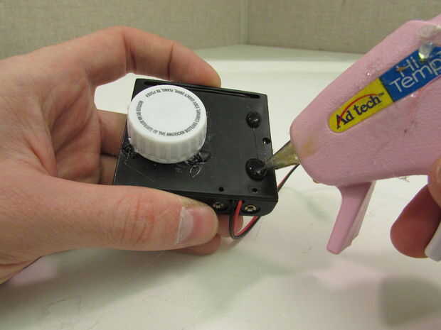 Voltee su batería y su tapa de la botella a la parte posterior del pegamento. Esto sólo debe tomar tres o cuatro pequeños dallops de la cola. Si utilizas demasiado, hará la tapa de la botella más difíciles de quitar posteriormente si decide salvar partes de este robot.