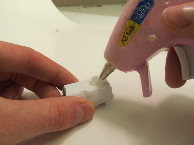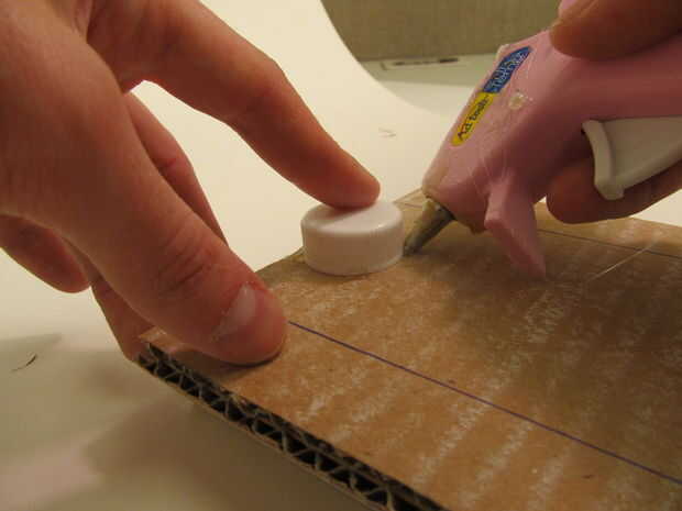 Comience agregando su tercera "rueda". Voltea tu robot y coloque la tapa de la botella en el extremo posterior. Tratar de conseguirlo más centrado posible y luego péguelo en con tres o cuatro pequeños gránulos de pegamento caliente.