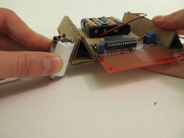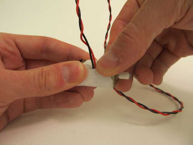 Ahora tome un momento para envolver sus motores en la cinta del conducto. Como con nuestro paquete de la batería y el microcontrolador, esta cinta protegerá nuestros motores de pegamento caliente y hacerlo más fácil retirar y colocar nuestros motores si necesitamos más adelante.