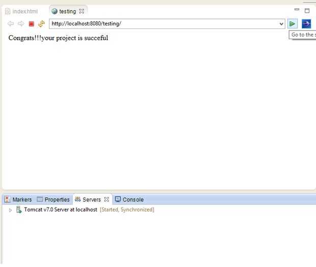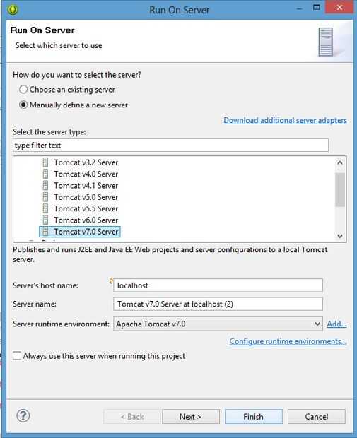 Haga clic en proyecto (pruebas) > como > ejecutar en servidor > definir manualmente servidor > elegir tomcat v7 >