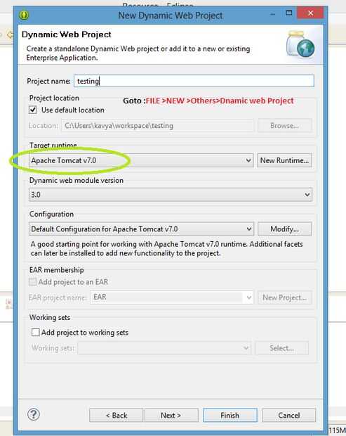 GOTO: Archivo > Nueva > Otros > nuevo proyecto Web dinámico > (asegurar ApacheTomcat v7.0 es en tiempo de ejecución de destino) > siguiente > siguiente > finalizar