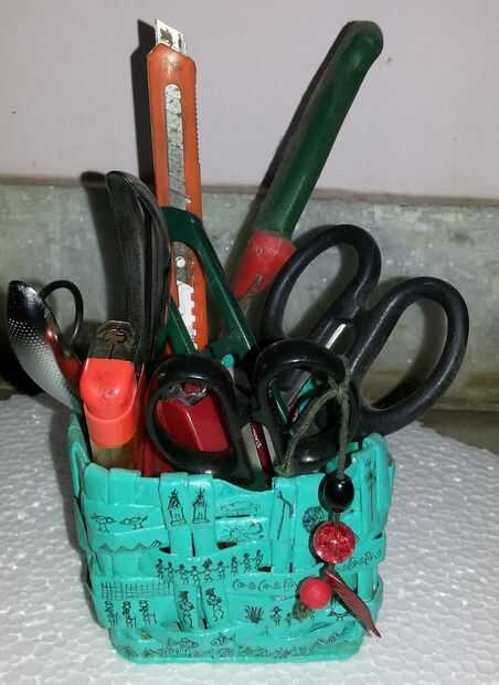 Almacenamiento para herramientas de arte - usted puede utilizar vasos de papel de tamaño grande para almacenar solo golpe máquina, cuchillo, tijeras, grapadora etc.. Yo realmente hechos a un soporte de herramienta de periódico y pintada con colores vivos. Entonces dibujé algunos arte Warli en él.