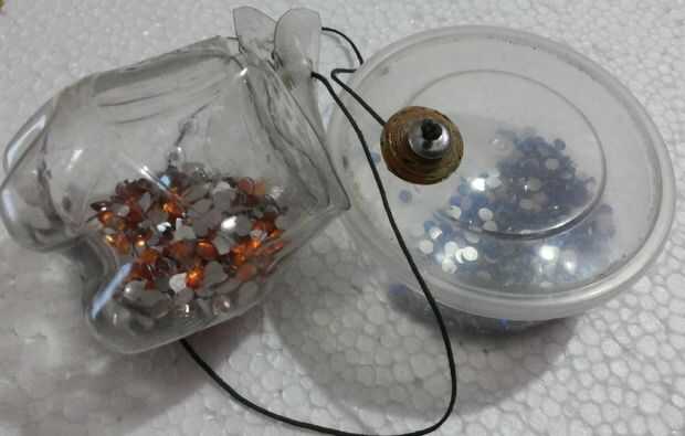 Almacenamiento para los Rhinestones- nuevo puede utilizar recipientes pequeños de entrega a domicilio para el almacenamiento de pedrería. Usé mis recipientes de sopa pequeña que me había salvado de la ensambladura de comida rápida cerca de mi casa. También utiliza botellas de Coca Cola antiguo y cortarlas a la mitad. Luego dent raja la 6 de la marca, particularmente Coca-Cola botellas tienen, hasta cierta longitud la abolladura es marcada (no corte a través de la abolladura hasta el fondo de la botella. Entonces será de ninguna utilidad). Las 6 secciones sirven como aletas para cerrar la boca de la botella medio cortada... Luego formó un recipiente así.